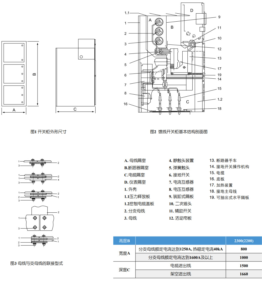 在電纜室內(nèi)單獨(dú)設(shè)立有5X40mm2的接地銅排能貫鄰相鄰的開關(guān)柜,并與柜體良好接觸。此接地排供直接接地之元器件使用。同時(shí)由于整個(gè)柜體用覆鋁鋅板相拼聯(lián),這樣使整個(gè)柜體都處在良好接地狀態(tài)之中,確保運(yùn)行操作人員觸及柜體**。開關(guān)設(shè)備外形尺寸(見圖1)